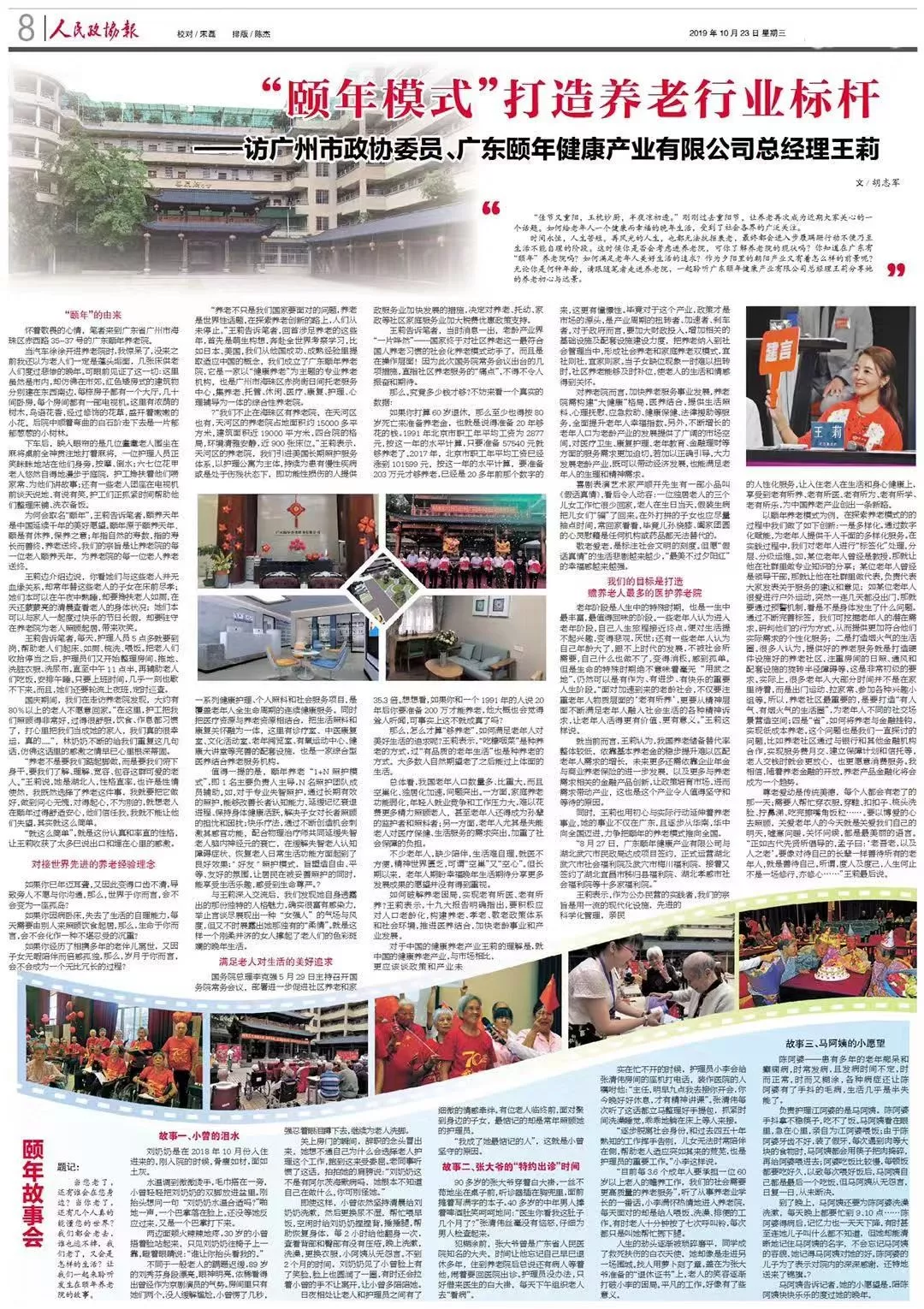 2019年10月23日,《人民政協報》媒體整版刊登《“頤年模式”打造養老行業標杆——訪廣州市政協委員、廣東頤年健康產業有限公司總經理王莉》,權威解讀頤年養老院的獨特養老模式!